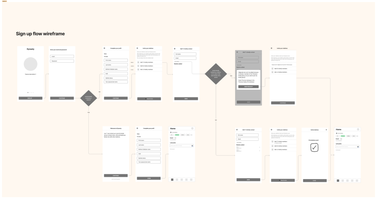 We went through multiple iterations of the onboarding flow to figure out how users would sign up and invite relatives from different families into the same ecosystem. We also had to define how users could interact with direct and extended relatives.